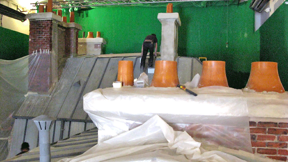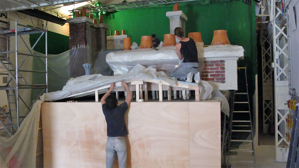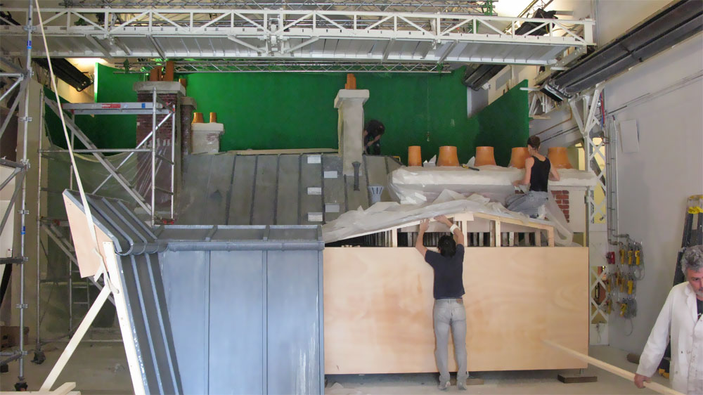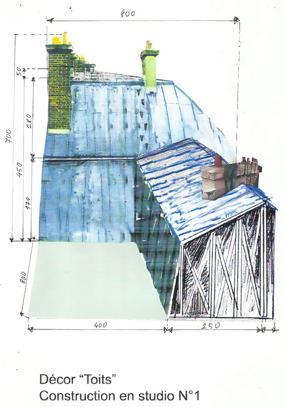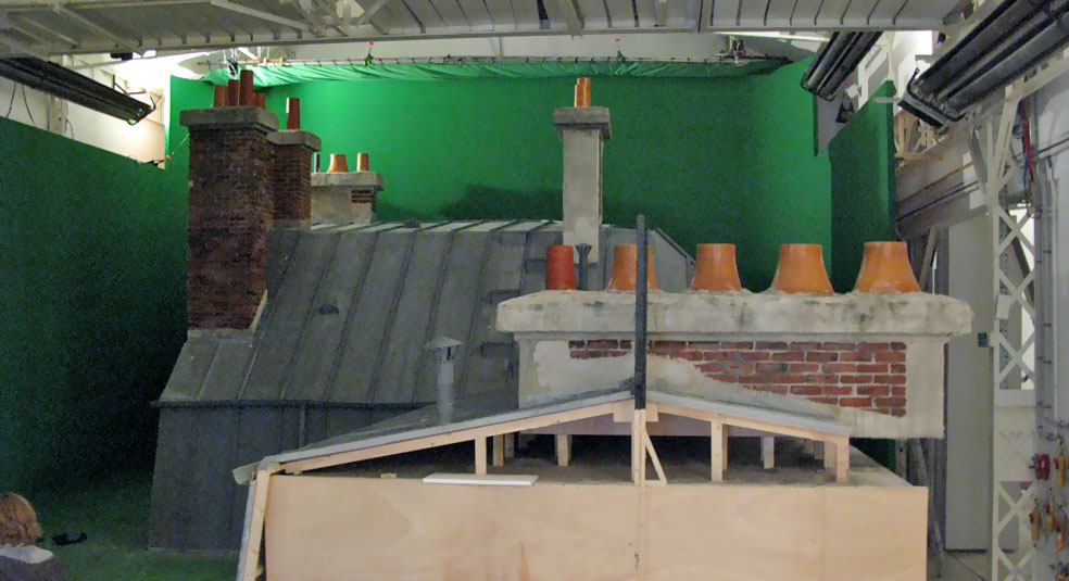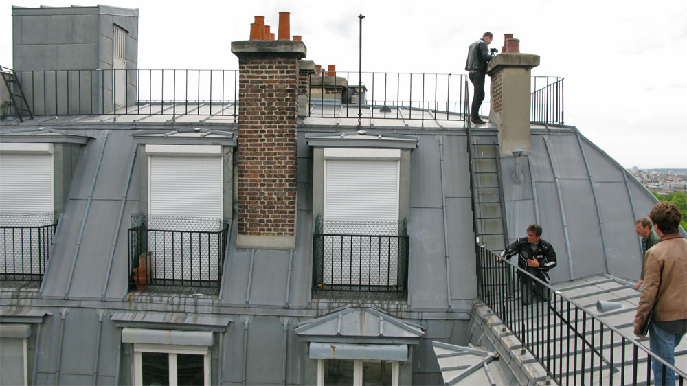 Mais la prouesse technique se situe au niveau des cascades : nous avons réussi à faire un vrai raccord avec un toit parisien construit en studio, évidemment à l’échelle 1/1 avec un budget quasi tenu (+3%).